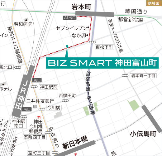 BIZ SMART神田富山町は、JR・東京メトロ銀座線「神田」駅まで徒歩3分、都営新宿線「岩本町」駅より徒歩3分、